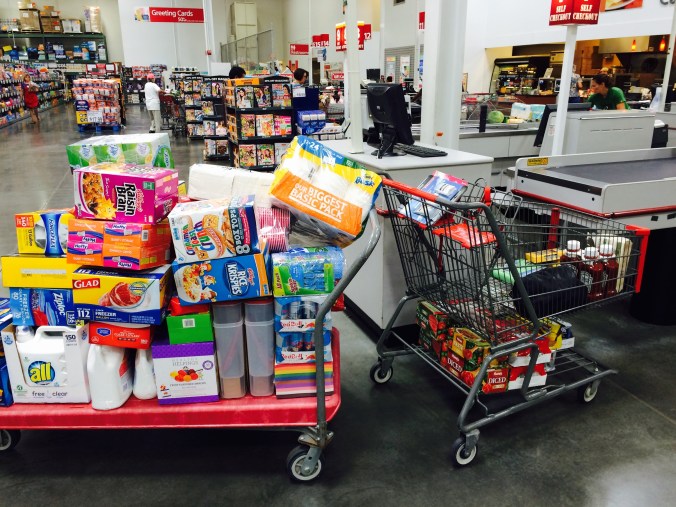Our pack-out is today, so we’ve been packing like it’s our job (well, I guess it is my job…). Last week, B spent the week at Crashbang (so now you can take your pick as to who will tie your tourniquet). I spent the week packing, and more importantly, completing our consumables shipment. The total volume of our shipment was only 1,560 lbs…a mere 60 lbs past 3/4 of a ton. Technically I did the majority of the shopping for the consumables at BJ’s, where the movers came to pack. I arrived when the store opened with my very detailed list (honed over several months of aimless-ish wandering through the aisles) and managed to fill a flat cart and two regular carts (which, of course, are much larger than “regular” when you are shopping at BJ’s). This was in addition to all the food and shampoo and toothpaste etc. I’ve been hoarding for months.