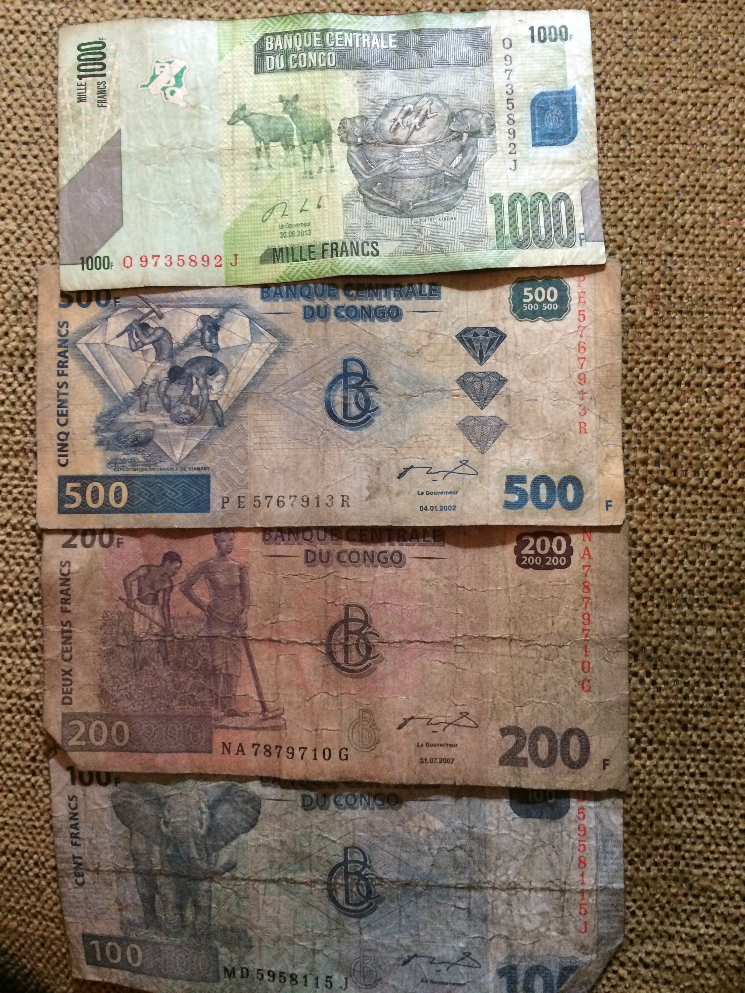 When you hand over your American money to cashiers, they will examine it carefully and, if it has a tear (even a tiny one) or a mark any bigger than about a 1/4 inch, they will hand it back to you and refuse to accept it. Meanwhile, the Congolese francs are filthy, ragged pieces of paper that, occasionally, are so difficult to read you don’t know if you have a 500 CF bill or a 100 CF bill (which are both blue), but they will accept them no matter what condition they are in.